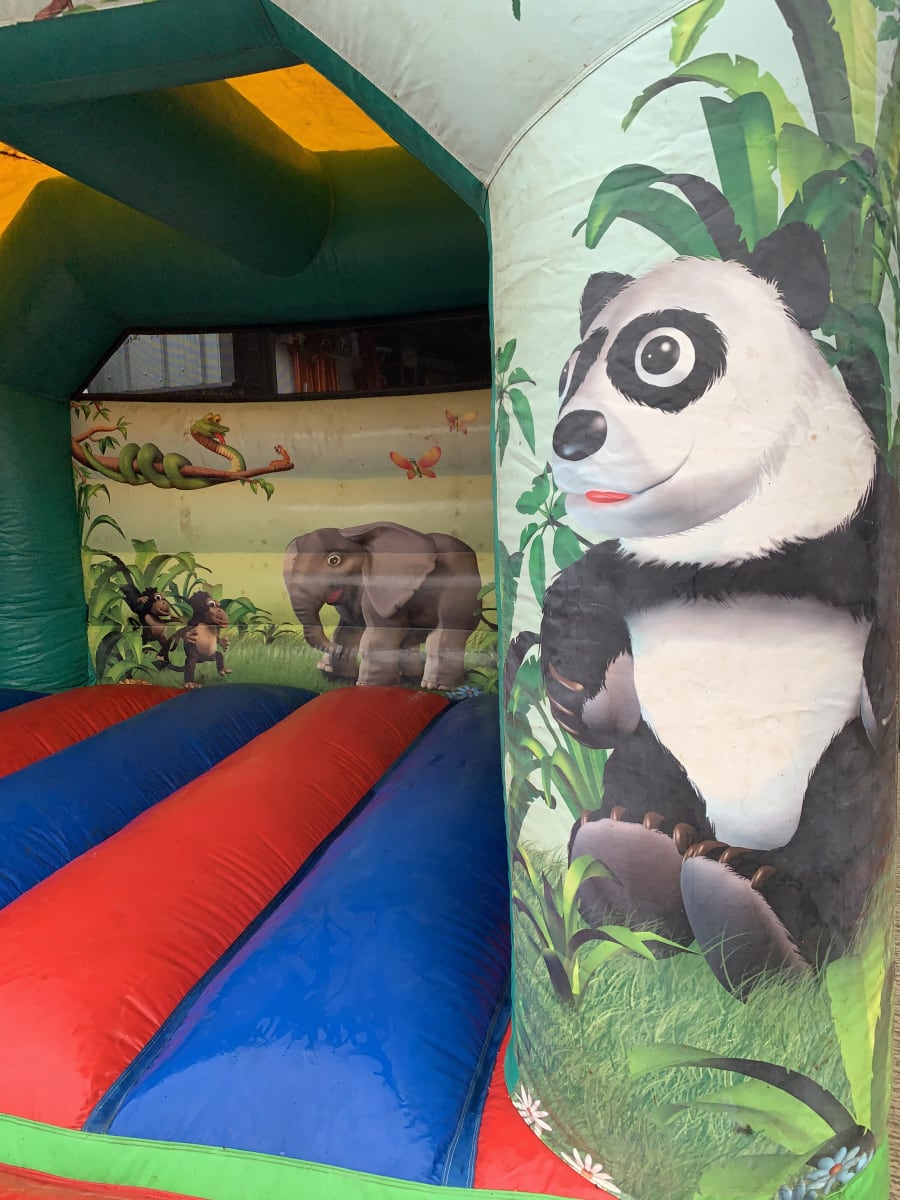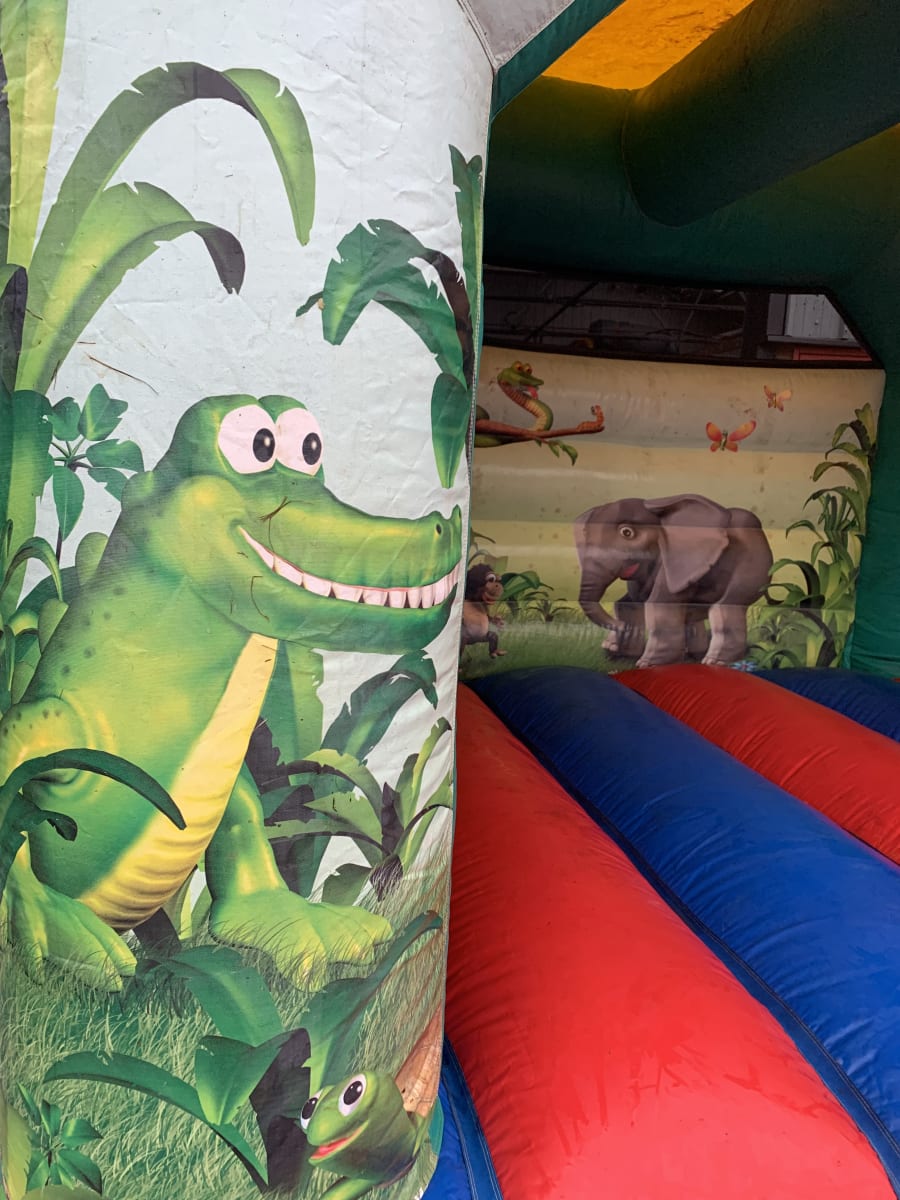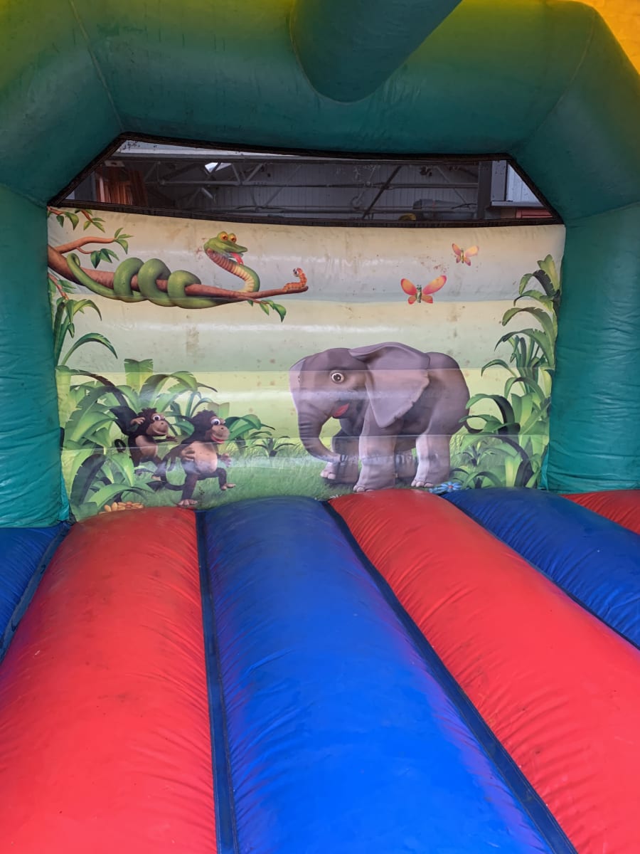Bouncy castle with a jungle theme with pictures of jungle animals on it.
