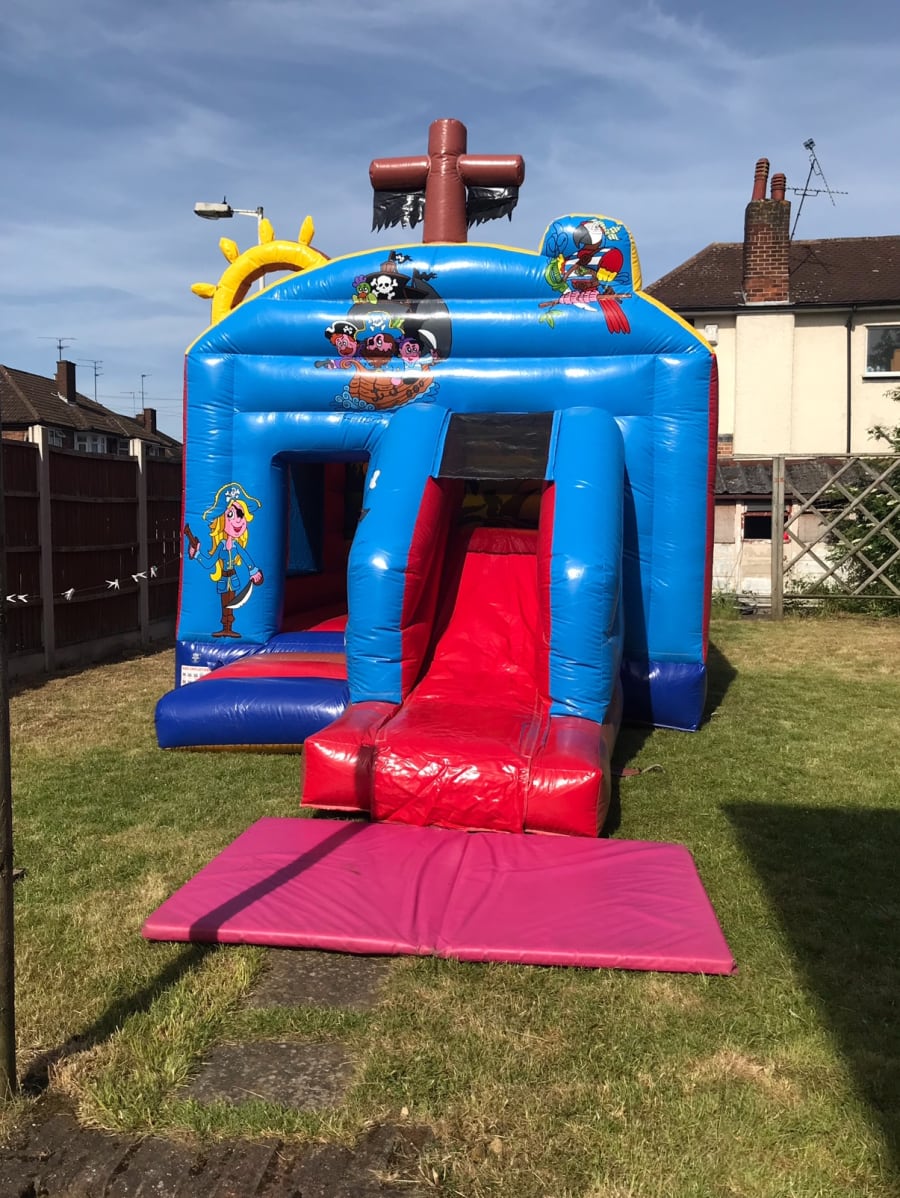 Bouncy castle with obstacle and slide in the pirate theme.